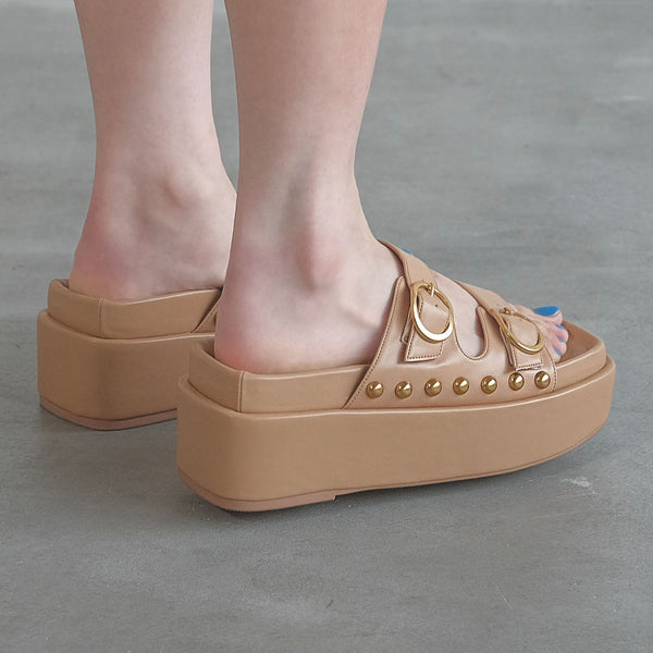 サイドのスタッズとそのボリューム感溢れるソールが特徴的なダニエラ&ジェマのダブルバックルベルトボリュームソールサンダル。