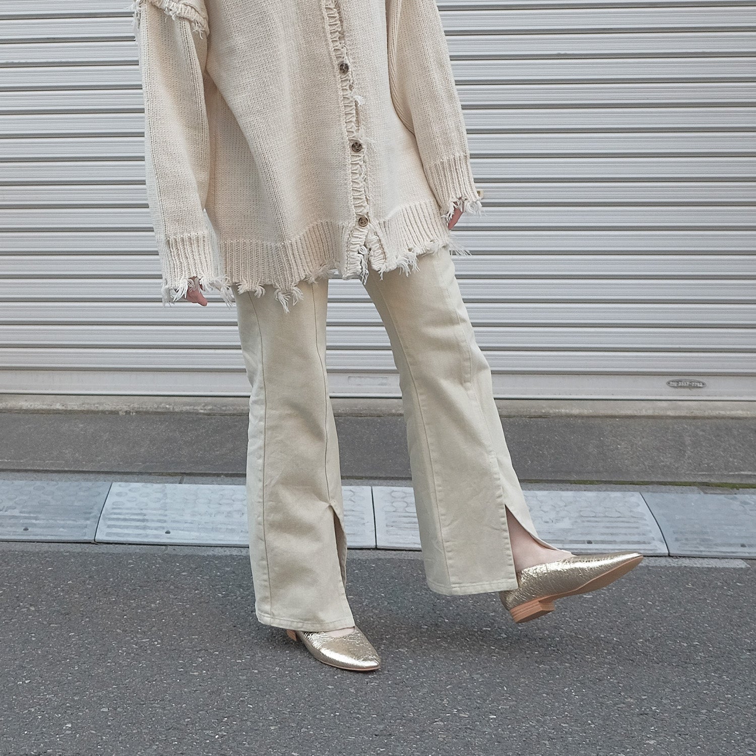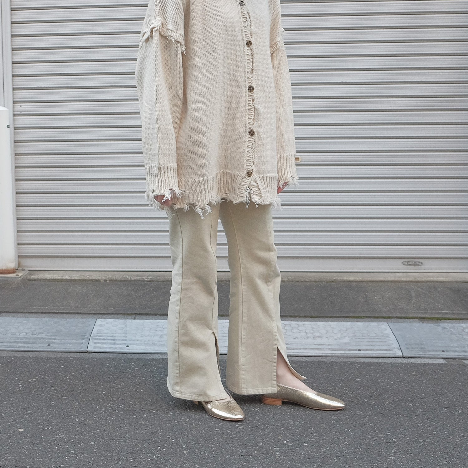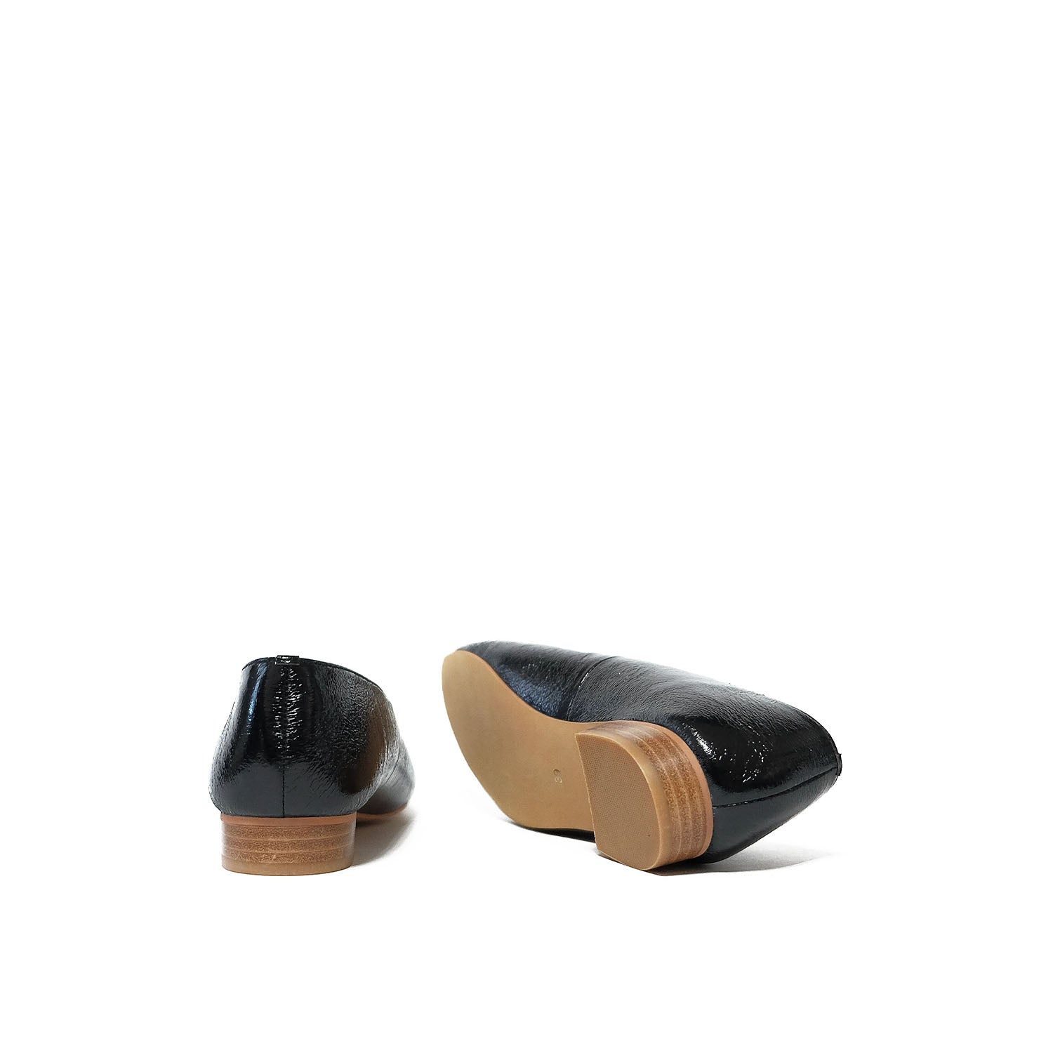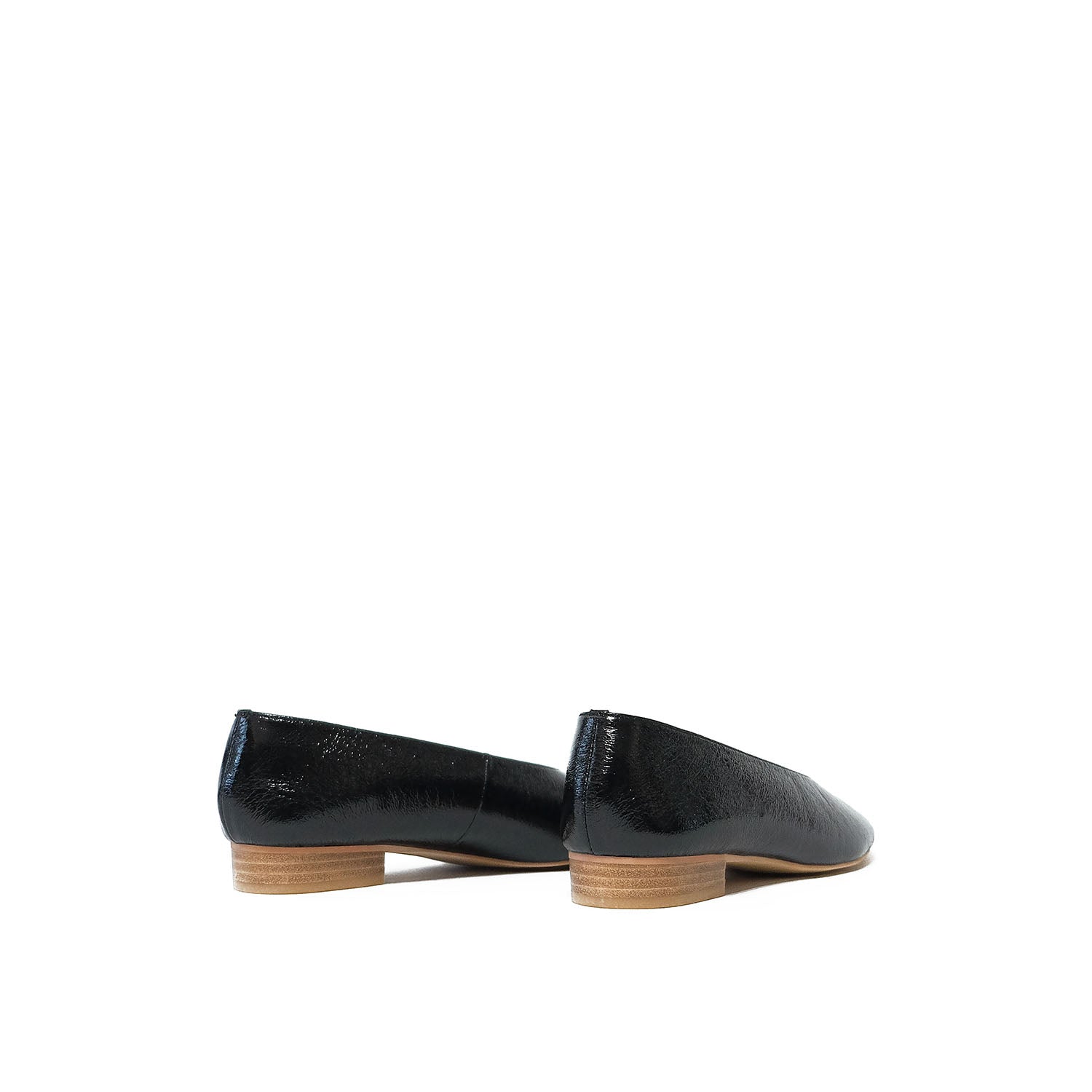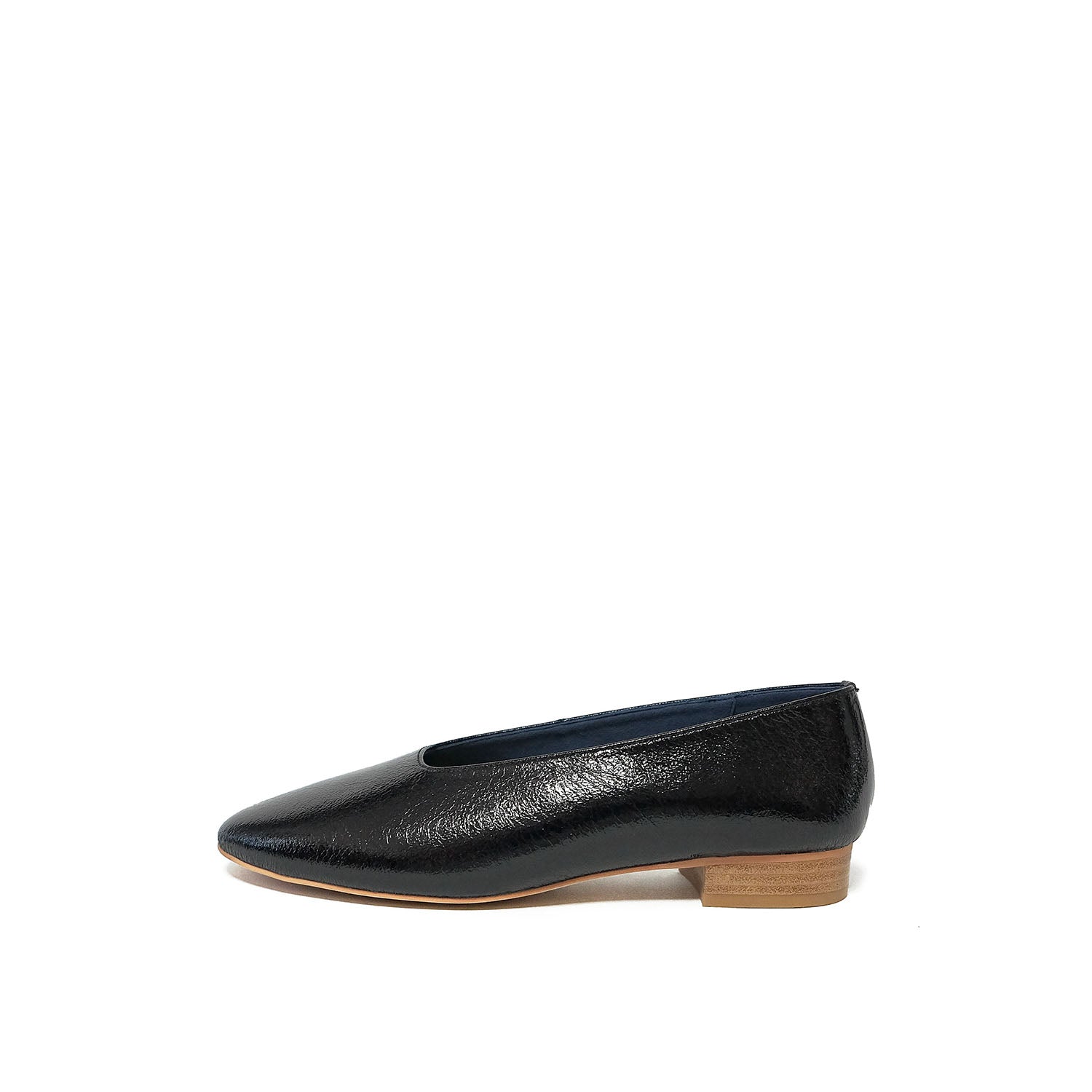 ・ラウンドトウと甲のスクエアカットの組み合わせで優しいフォルムにクールさをプラスした印象のフラットシューズ