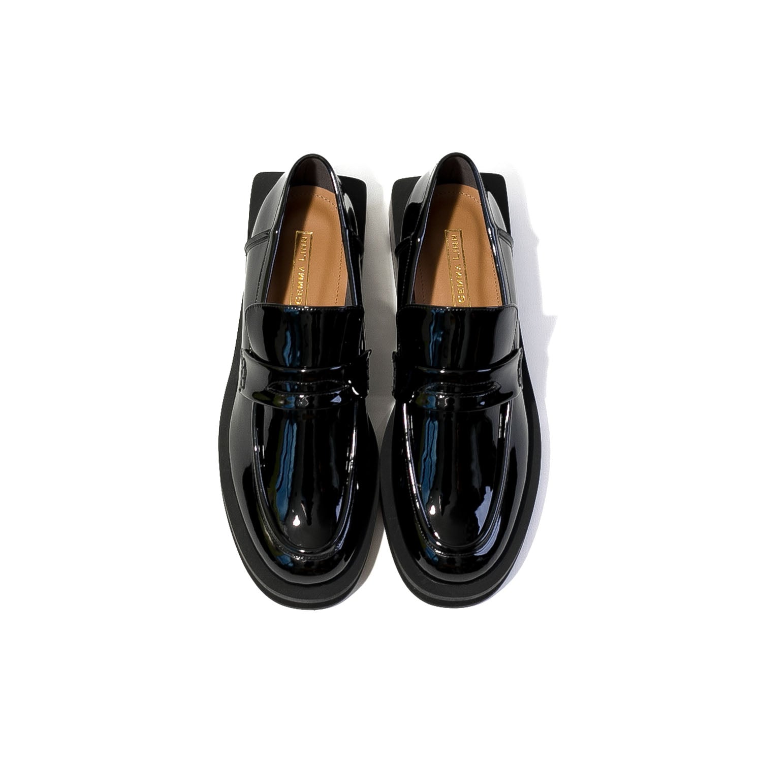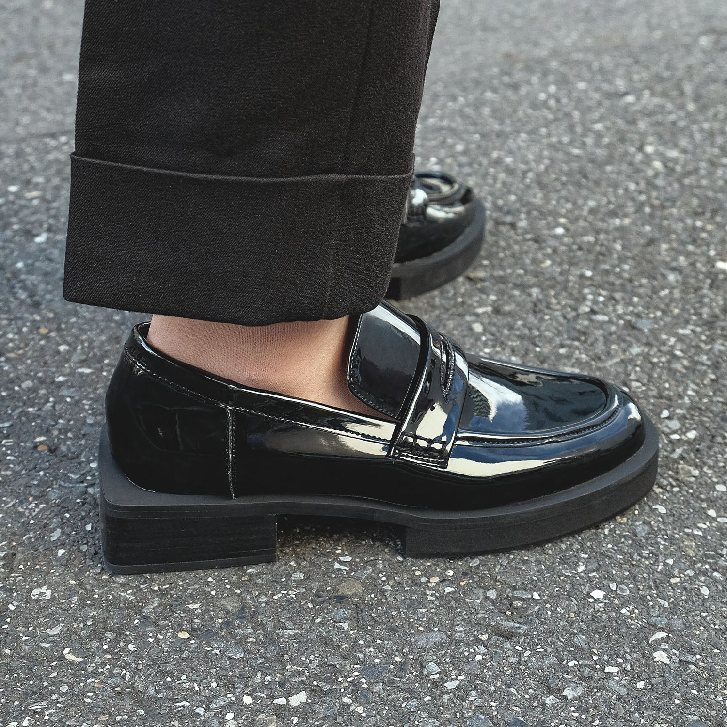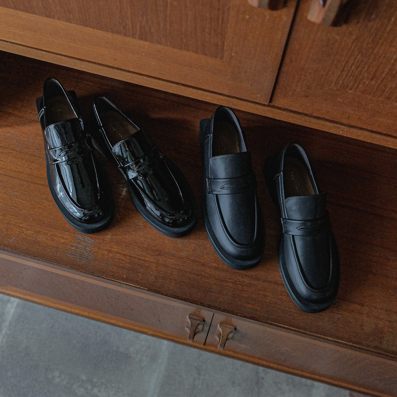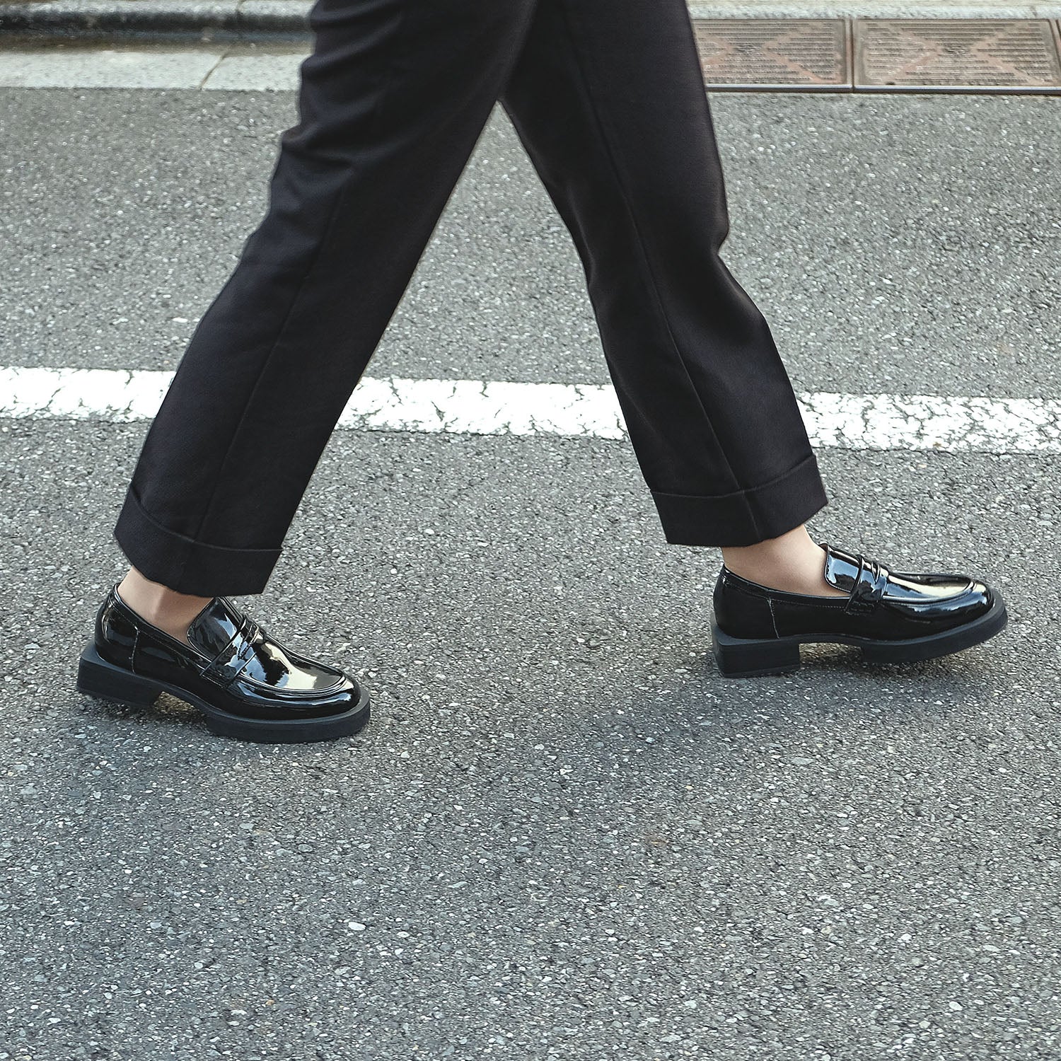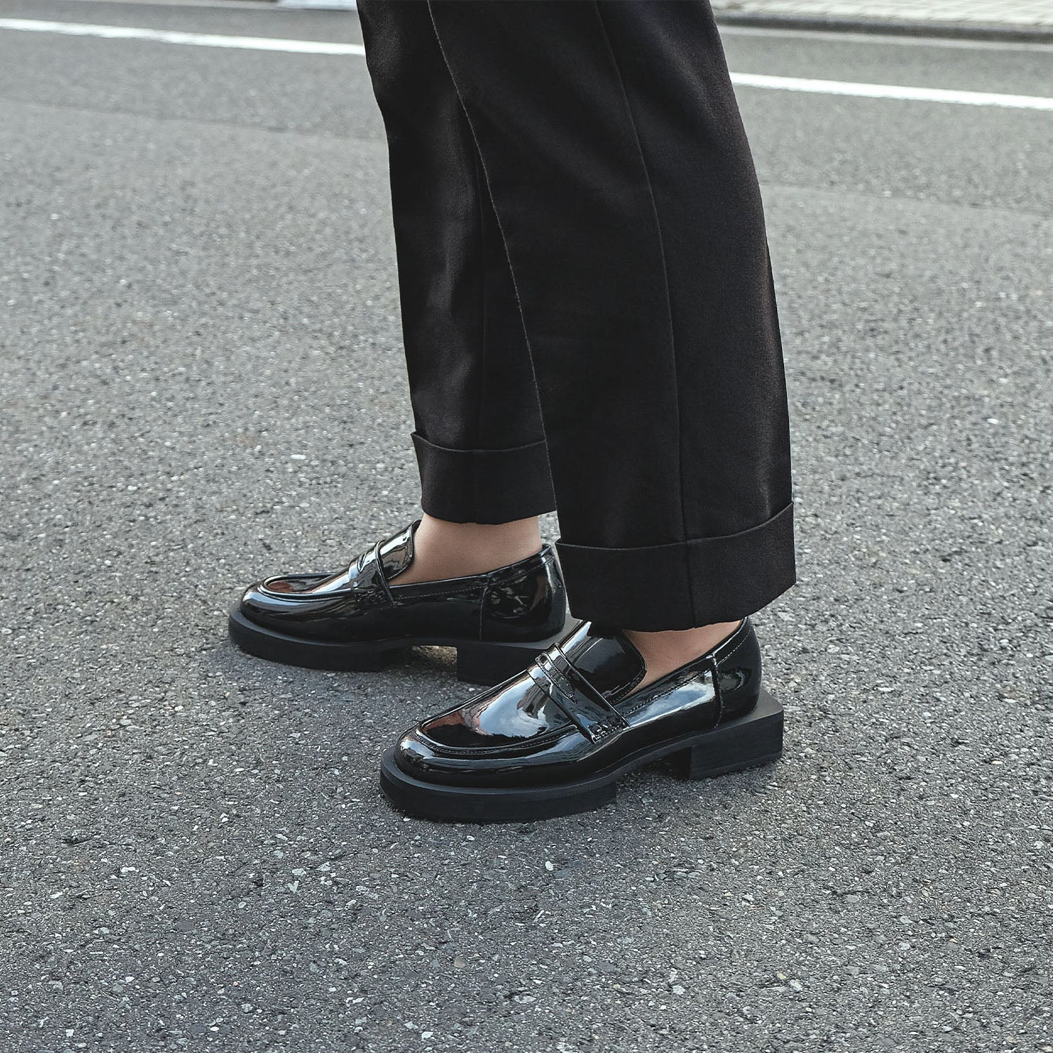 ・程よい厚底ローファーはどんなスタイルにもマッチするマットなスムース素材とつやのあるエナメル素材のいずれもブラックカラーの2色展開