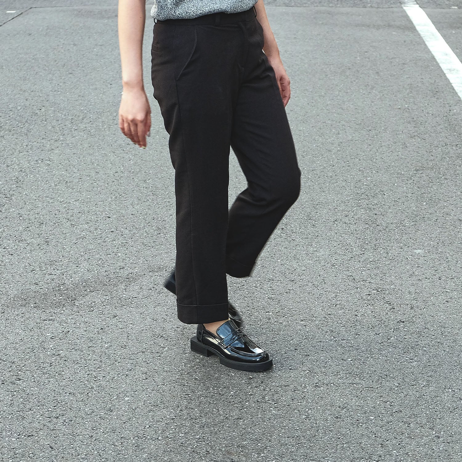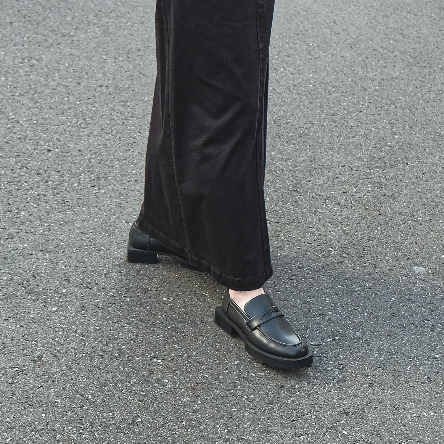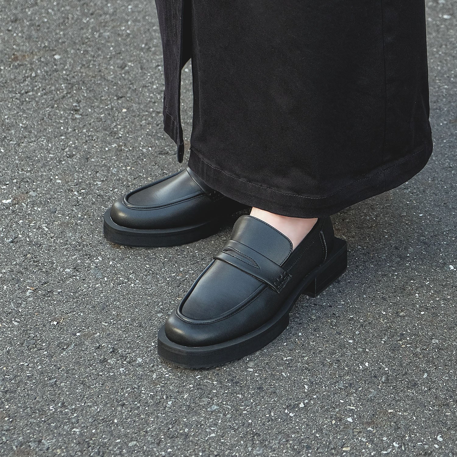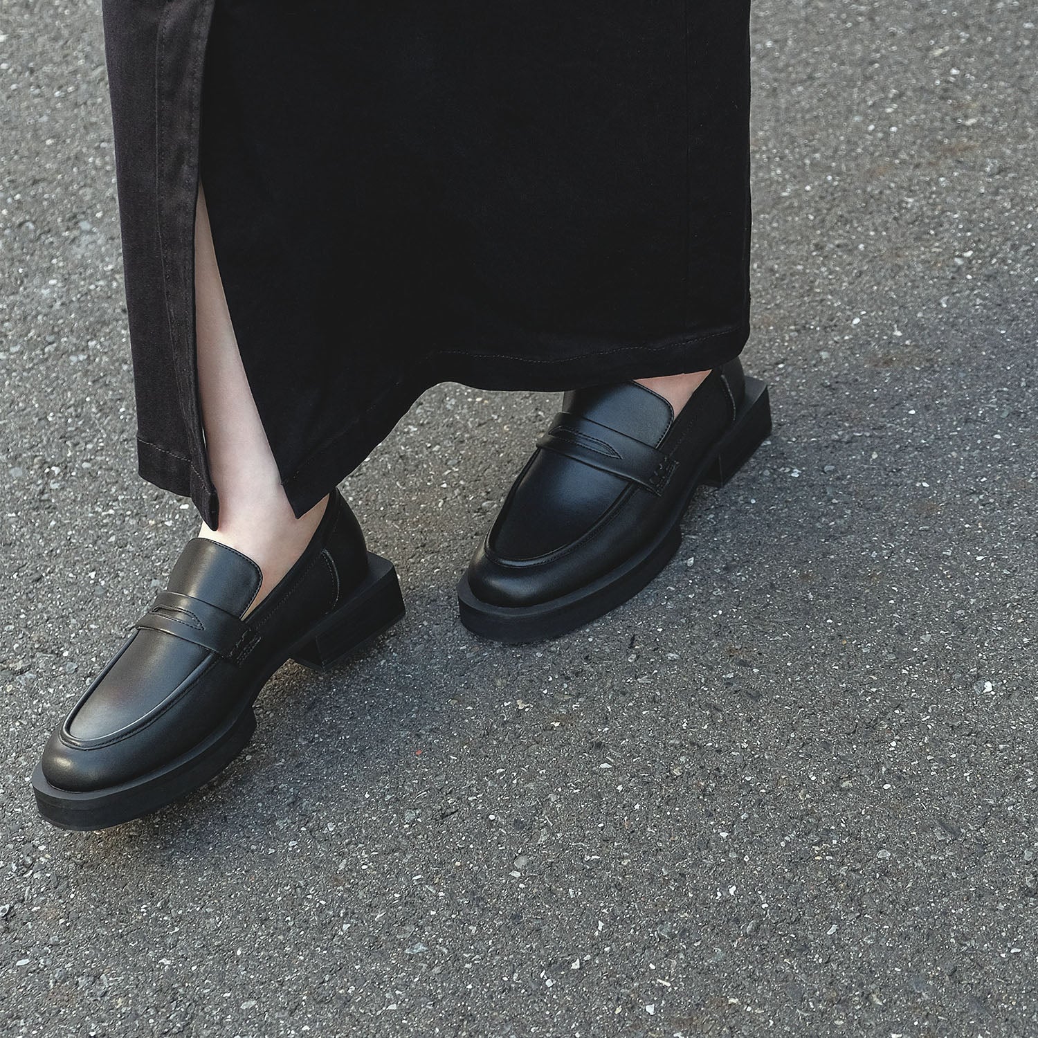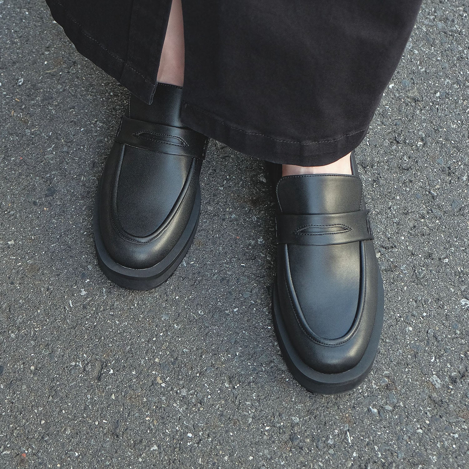 ・程よい厚底ローファーはどんなスタイルにもマッチするマットなスムース素材とつやのあるエナメル素材のいずれもブラックカラーの2色展開