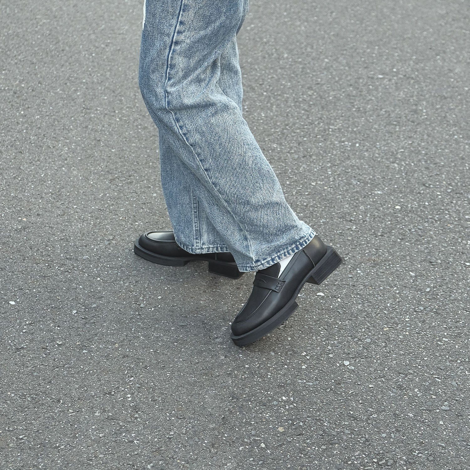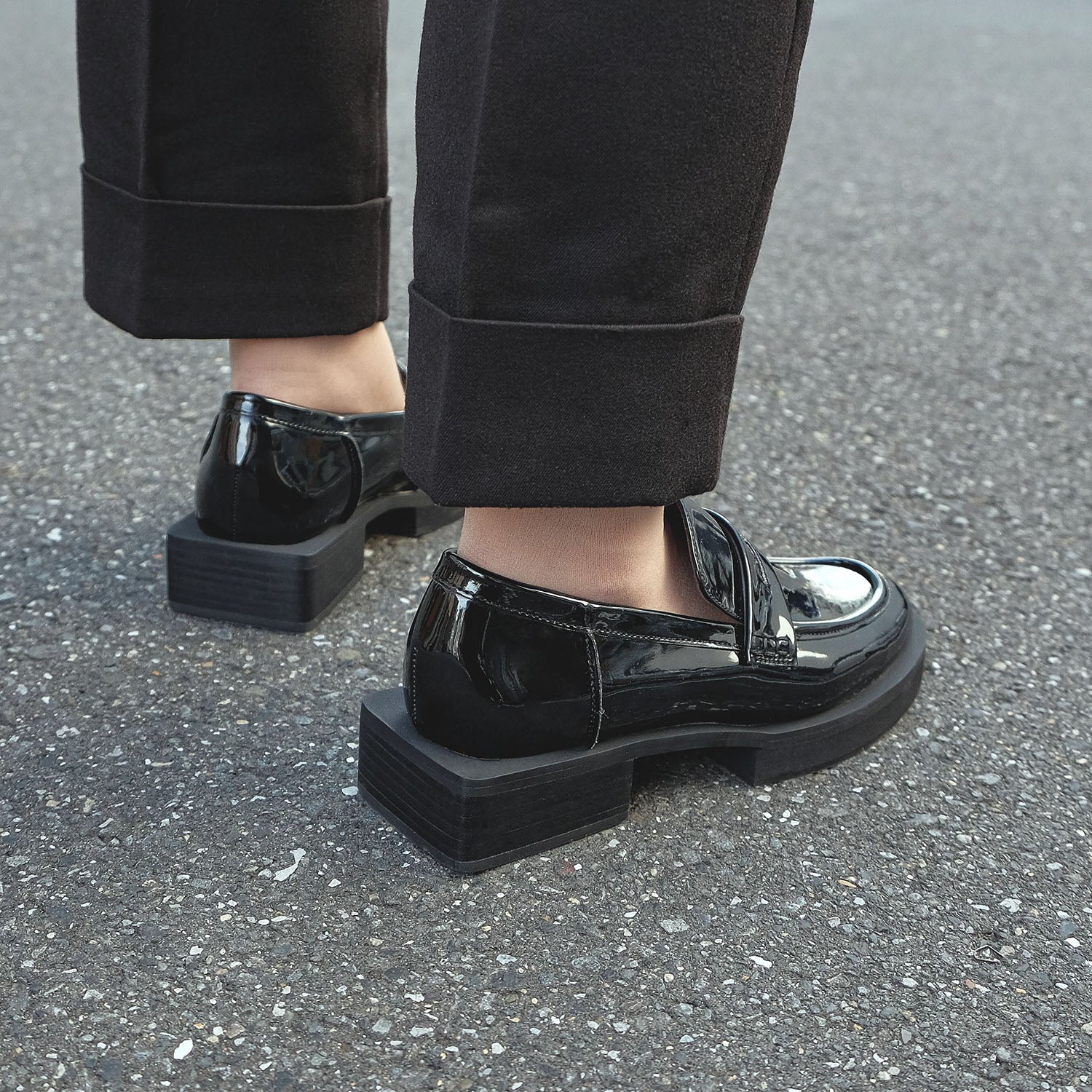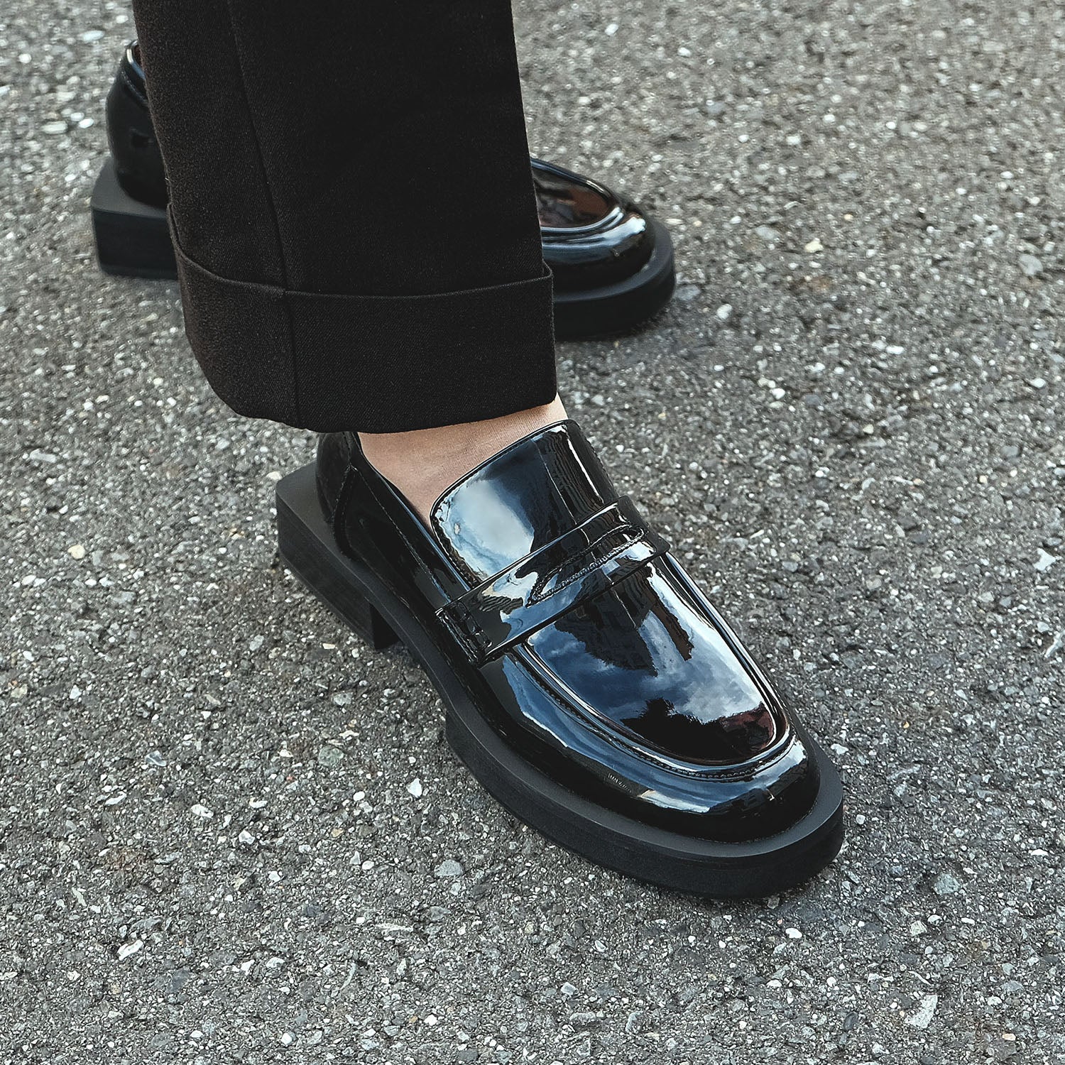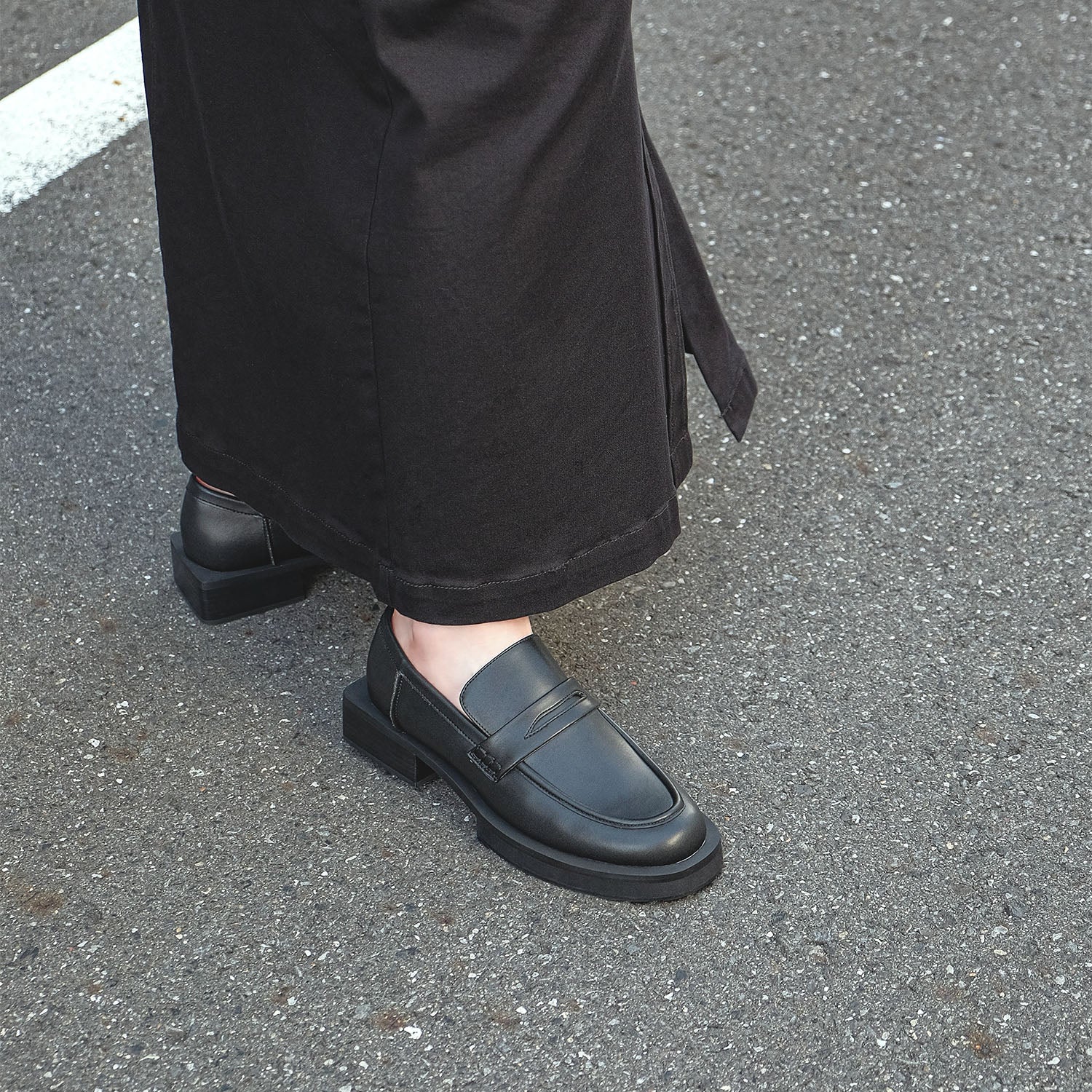 ・程よい厚底ローファーはどんなスタイルにもマッチするマットなスムース素材とつやのあるエナメル素材のいずれもブラックカラーの2色展開
