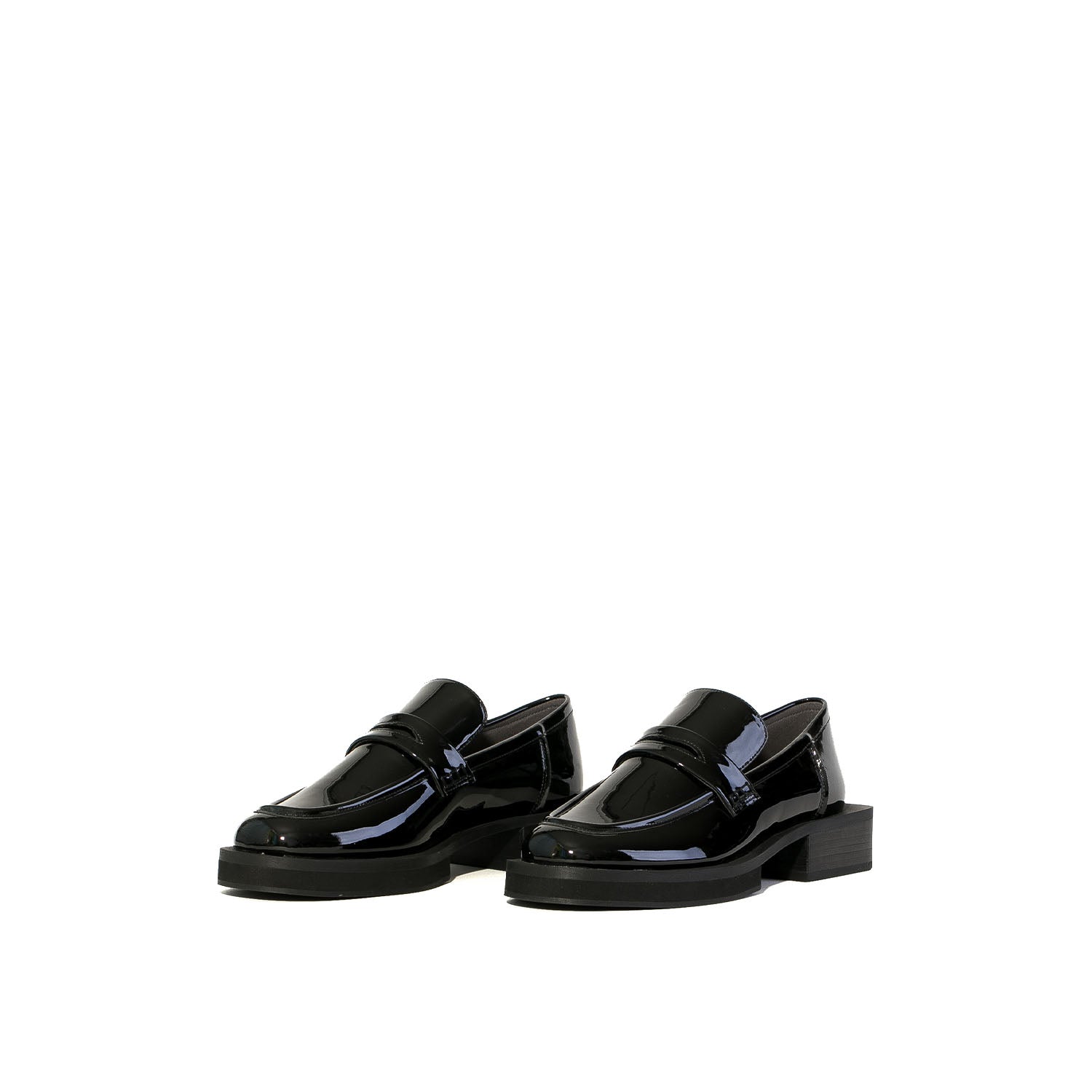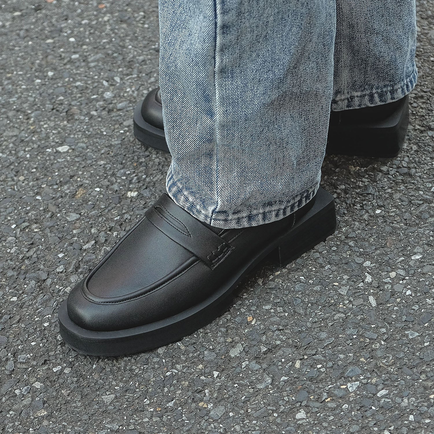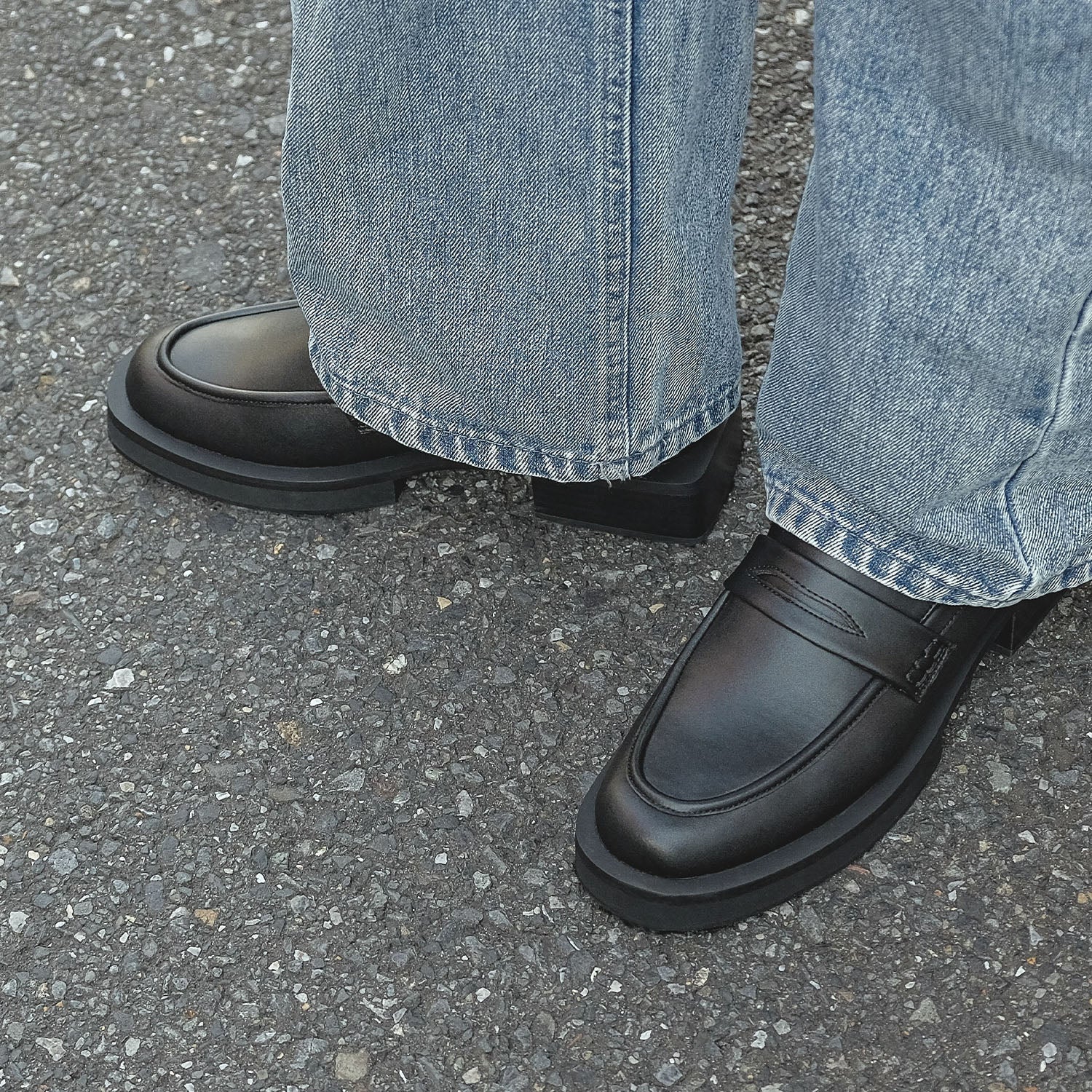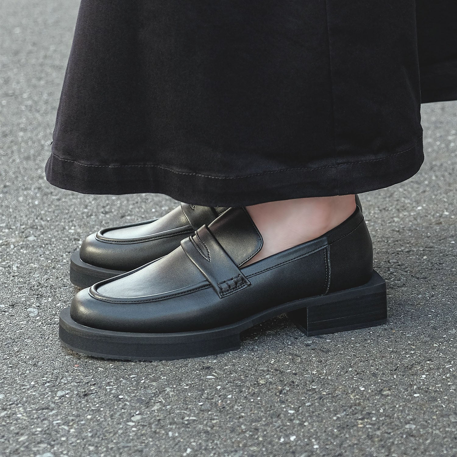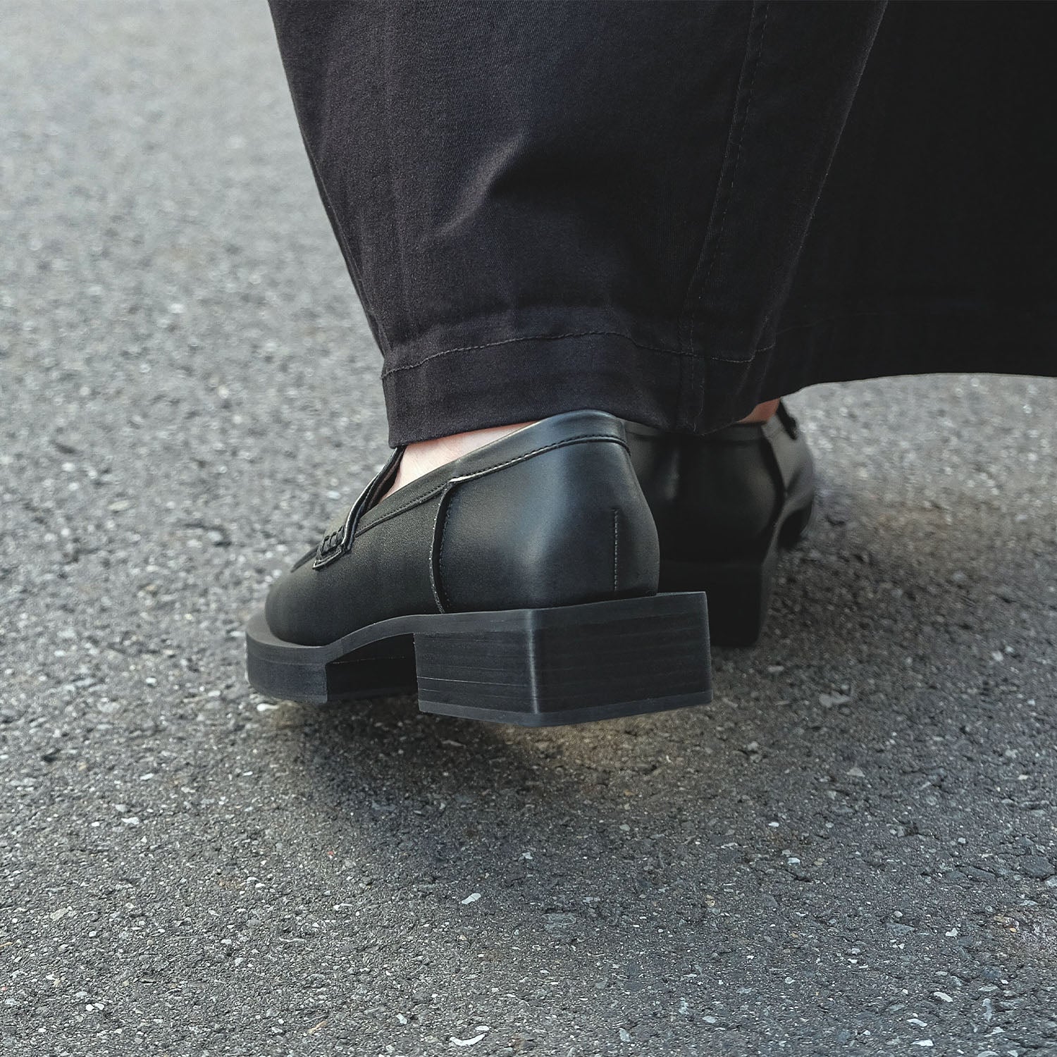 ・程よい厚底ローファーはどんなスタイルにもマッチするマットなスムース素材とつやのあるエナメル素材のいずれもブラックカラーの2色展開