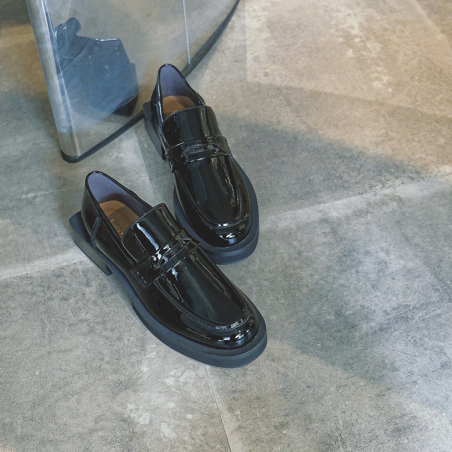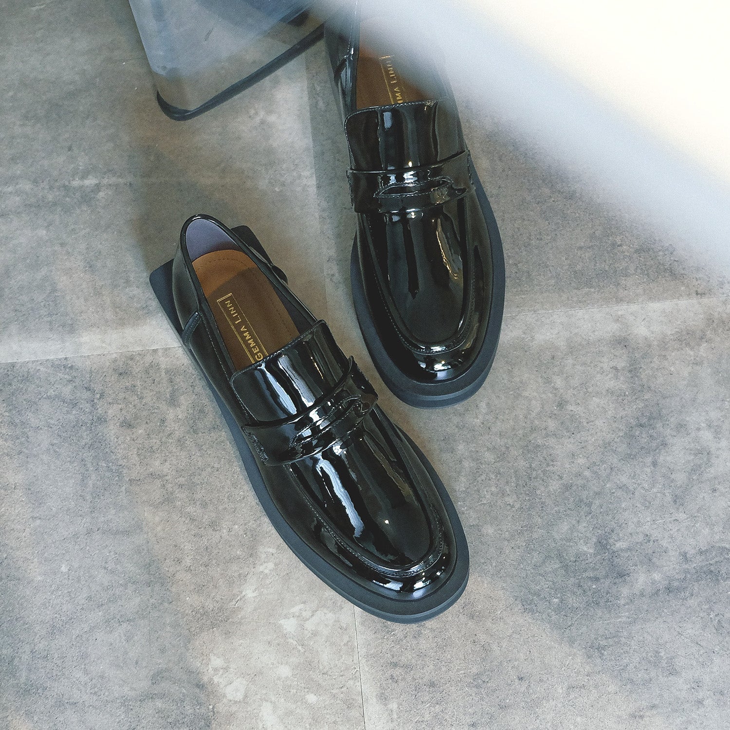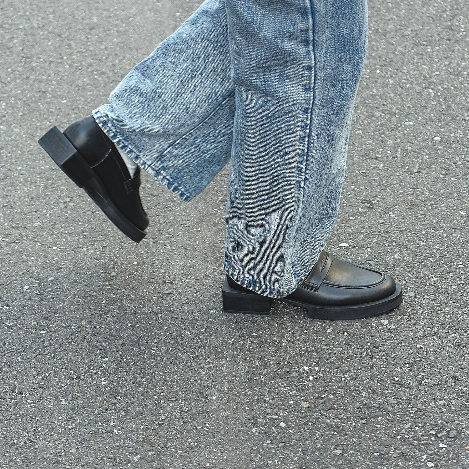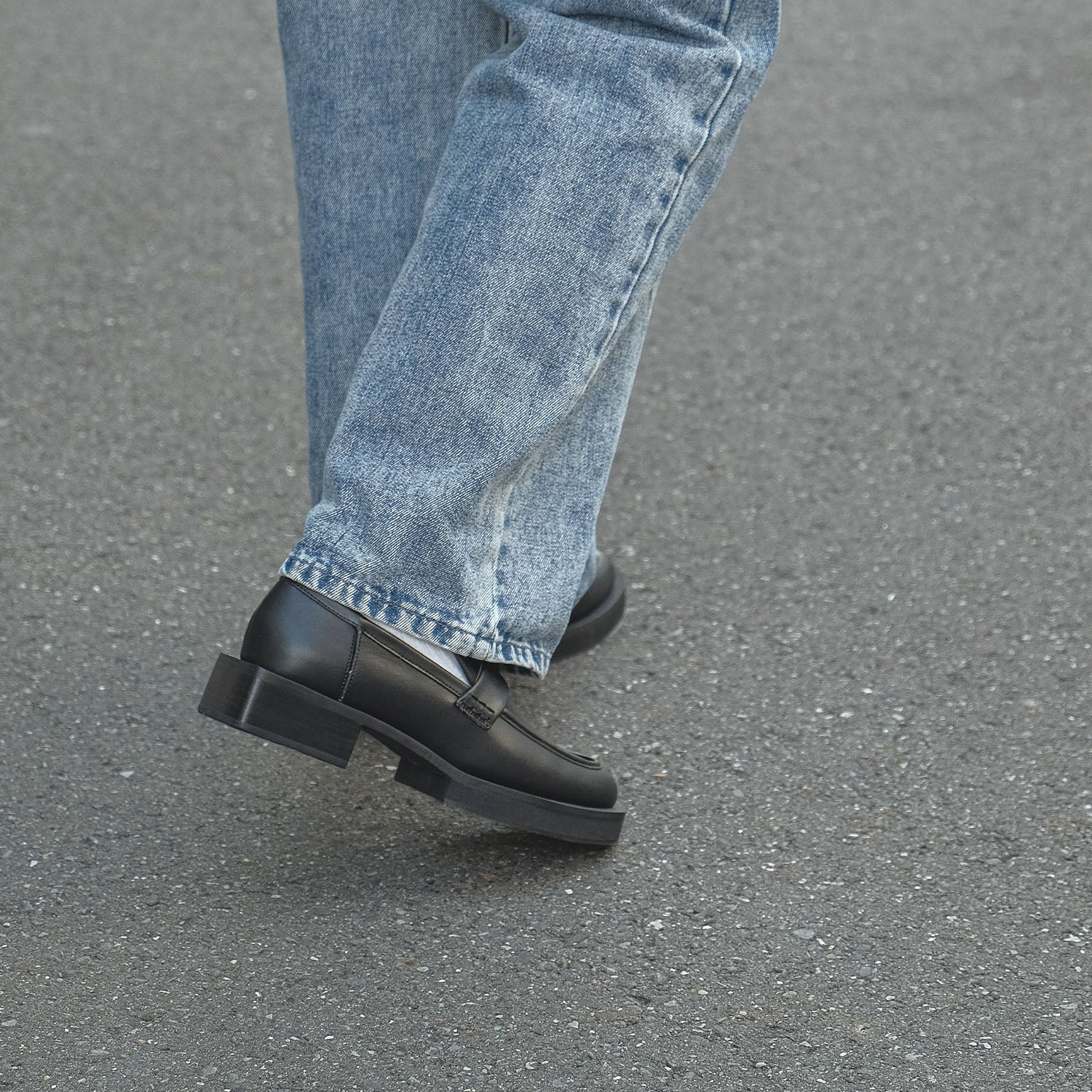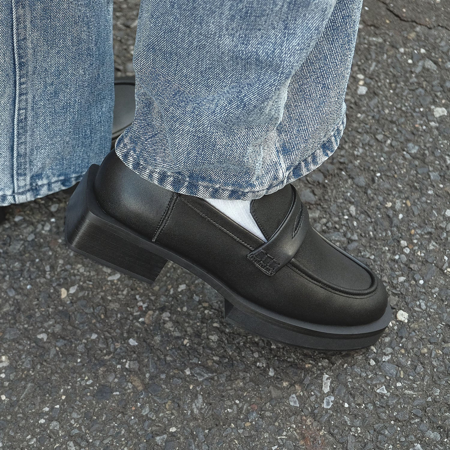・程よい厚底ローファーはどんなスタイルにもマッチするマットなスムース素材とつやのあるエナメル素材のいずれもブラックカラーの2色展開