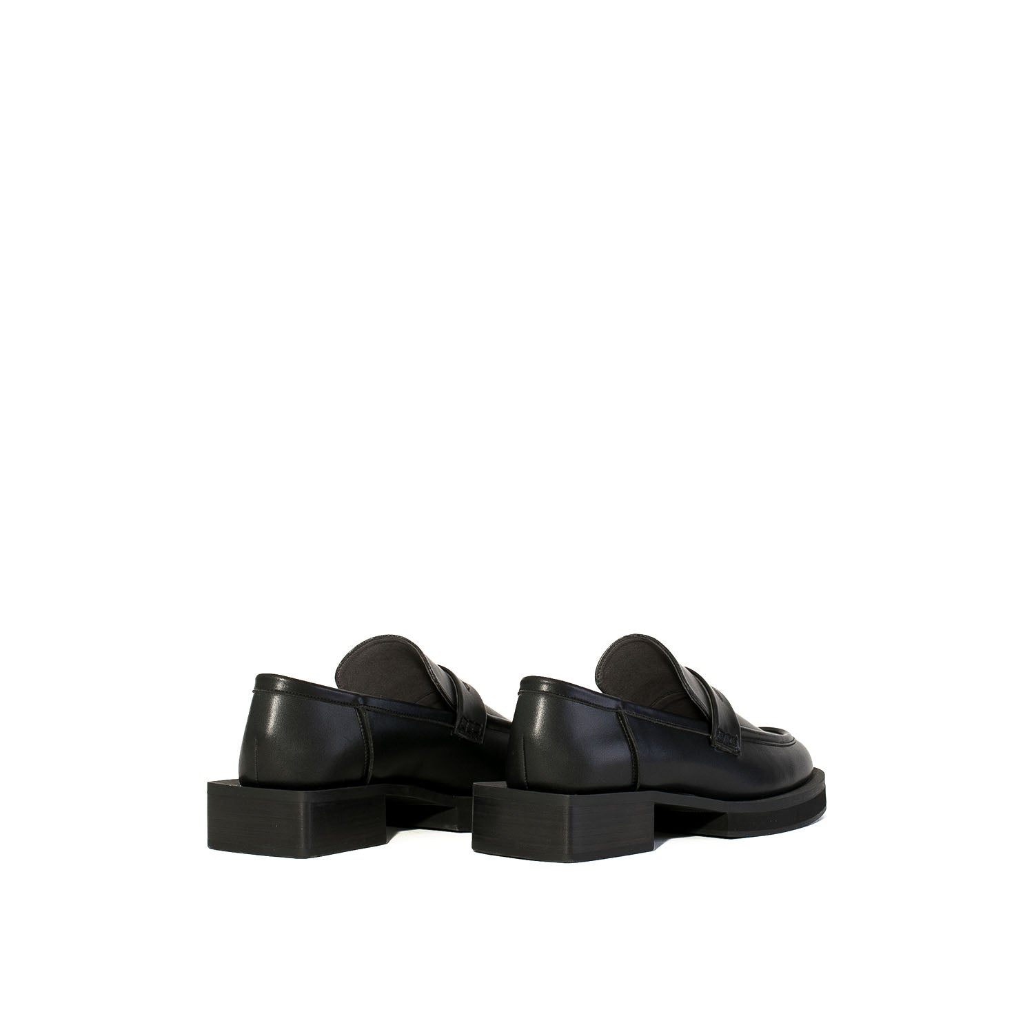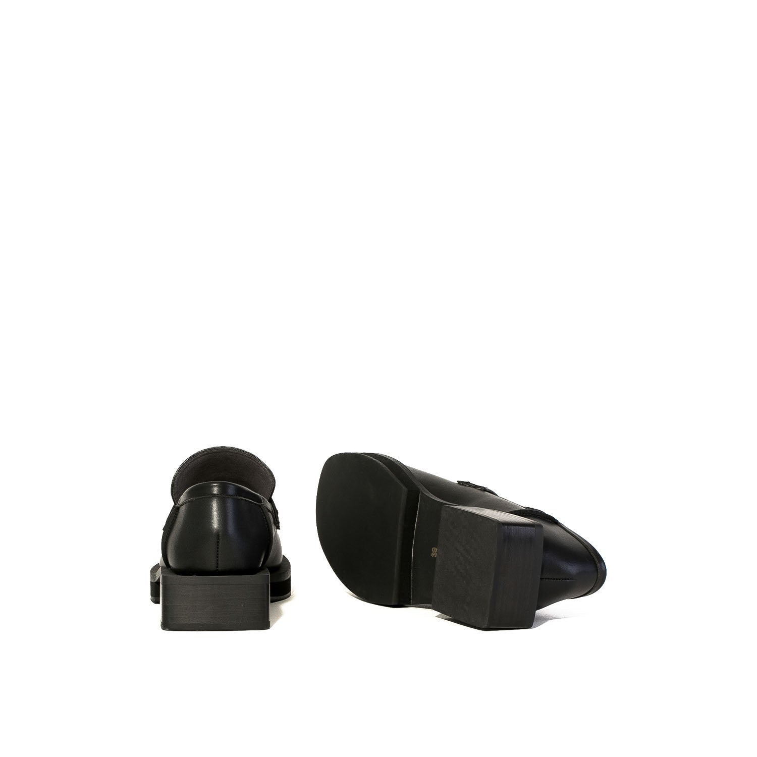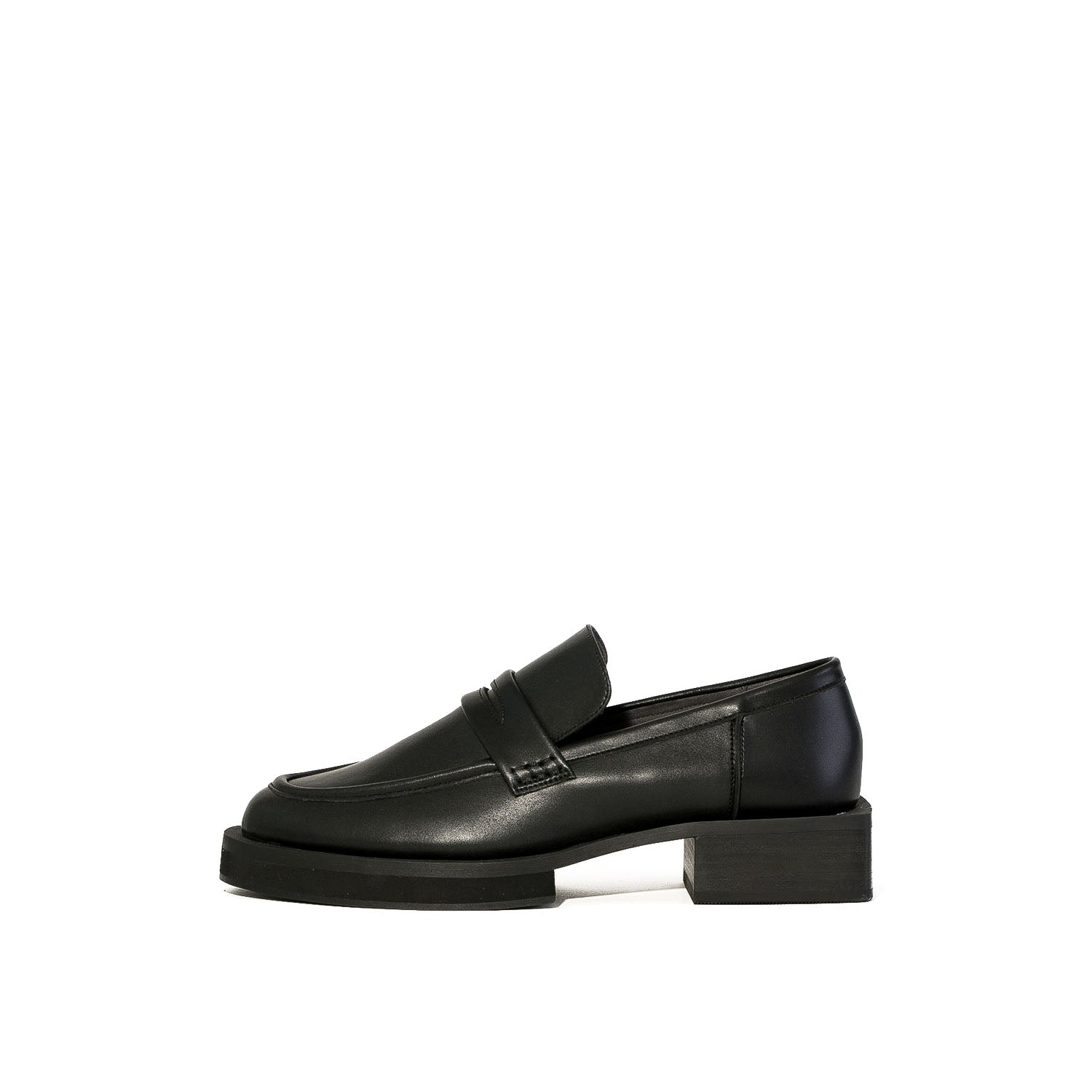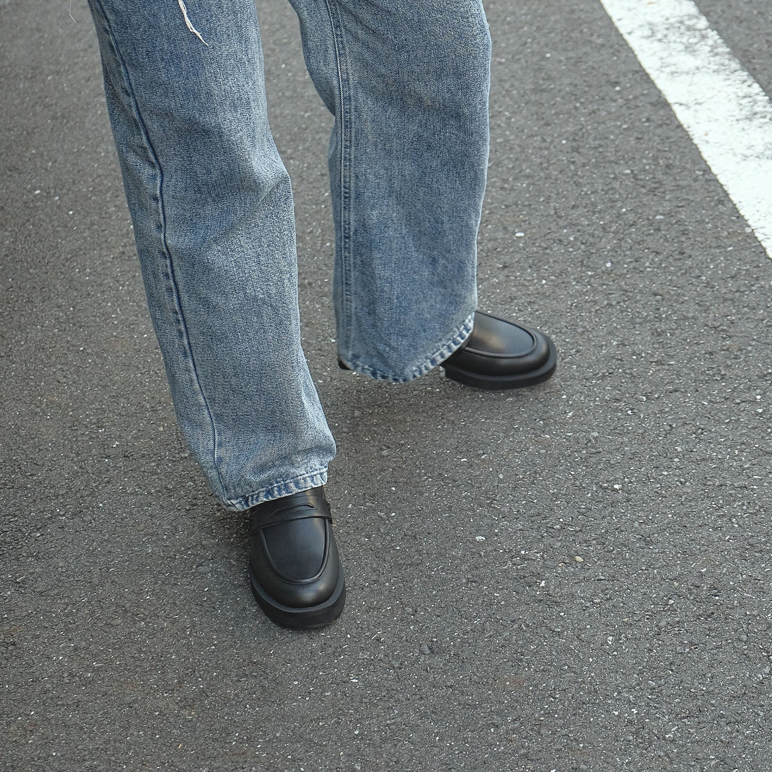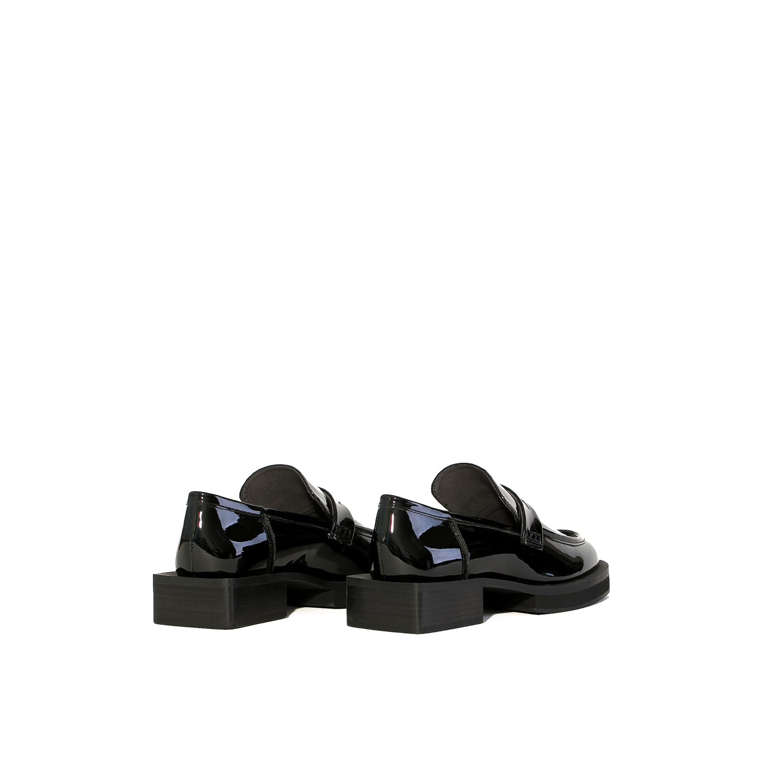 ・程よい厚底ローファーはどんなスタイルにもマッチするマットなスムース素材とつやのあるエナメル素材のいずれもブラックカラーの2色展開