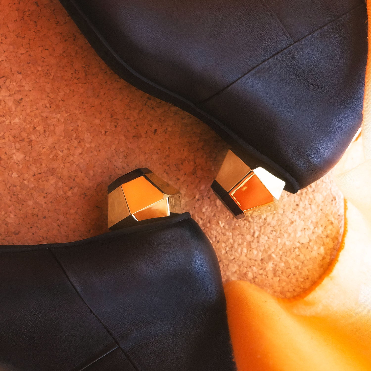 ・シンプルなスタイルに華やかなゴールドのヒールを合わせた一足