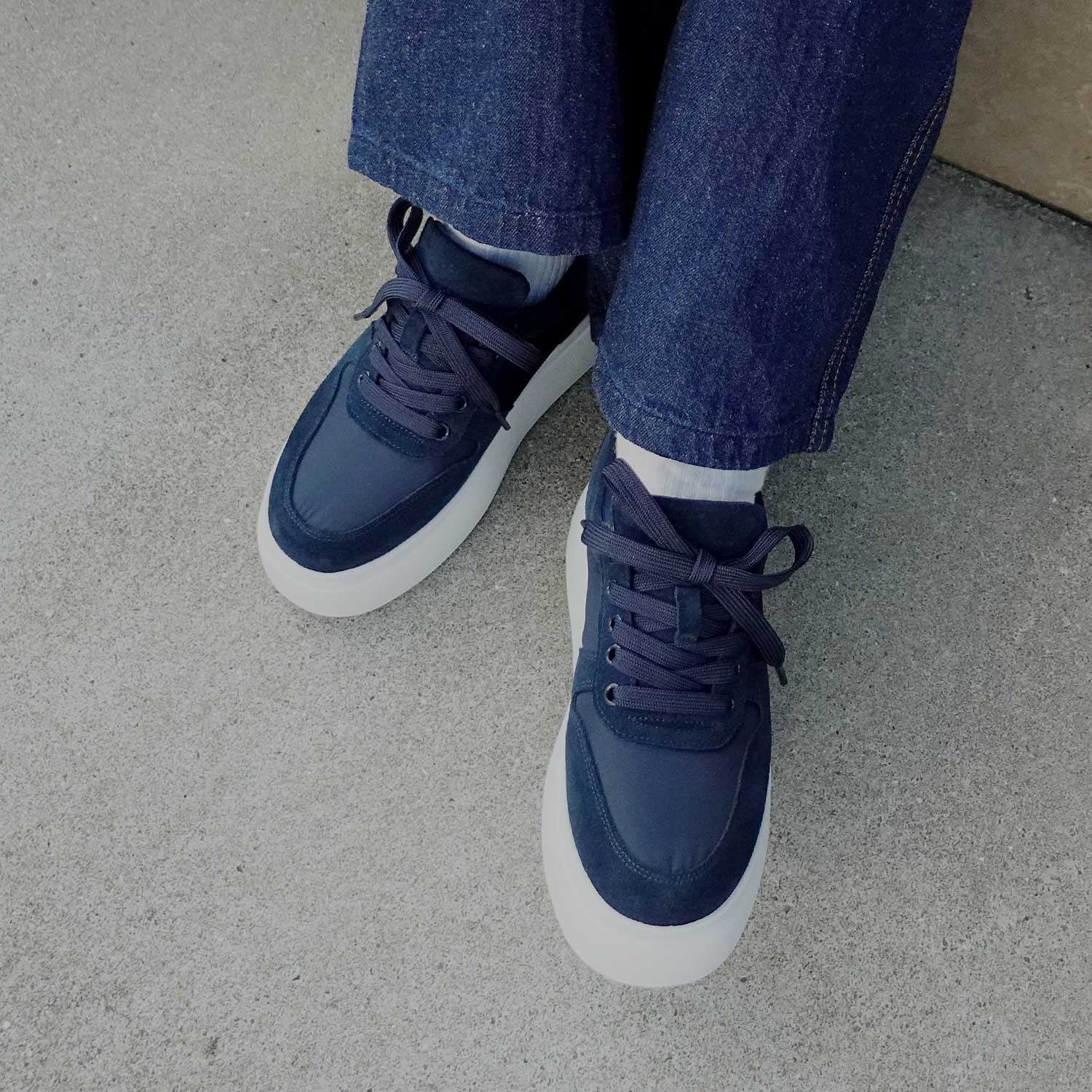 アッパーはマットなナイロン素材と本革スエードのコンビネーション、