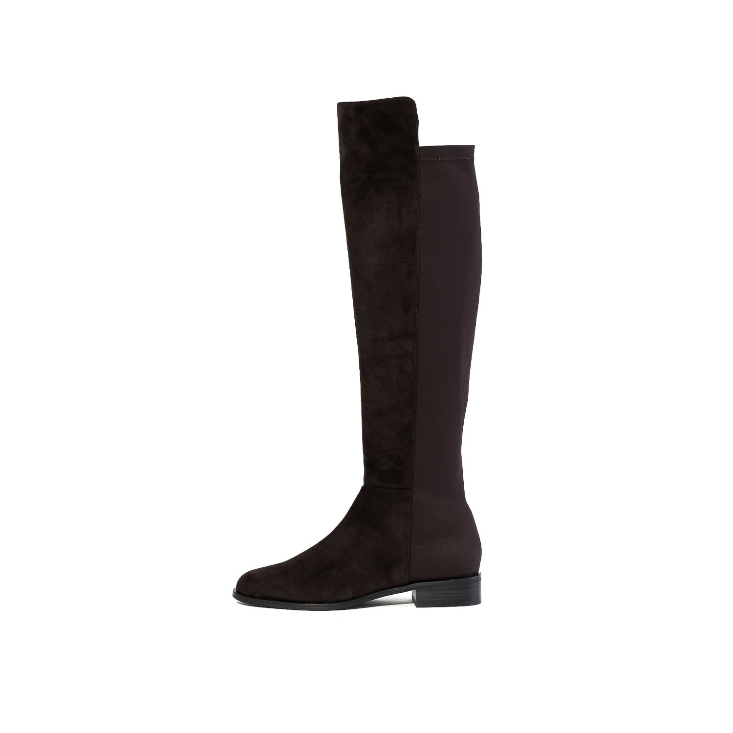 一枚甲のパターンとストレッチ素材を組み合わせることで履きやすさと美脚効果の両方を叶えたロングブーツ。